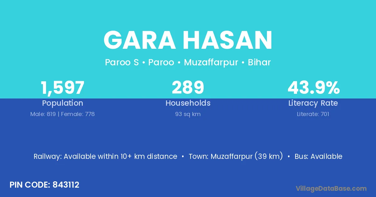Muzaffarpur (39 km) is the nearest town to Gara Hasan village for major economic activities and is located approximately 39 km away.