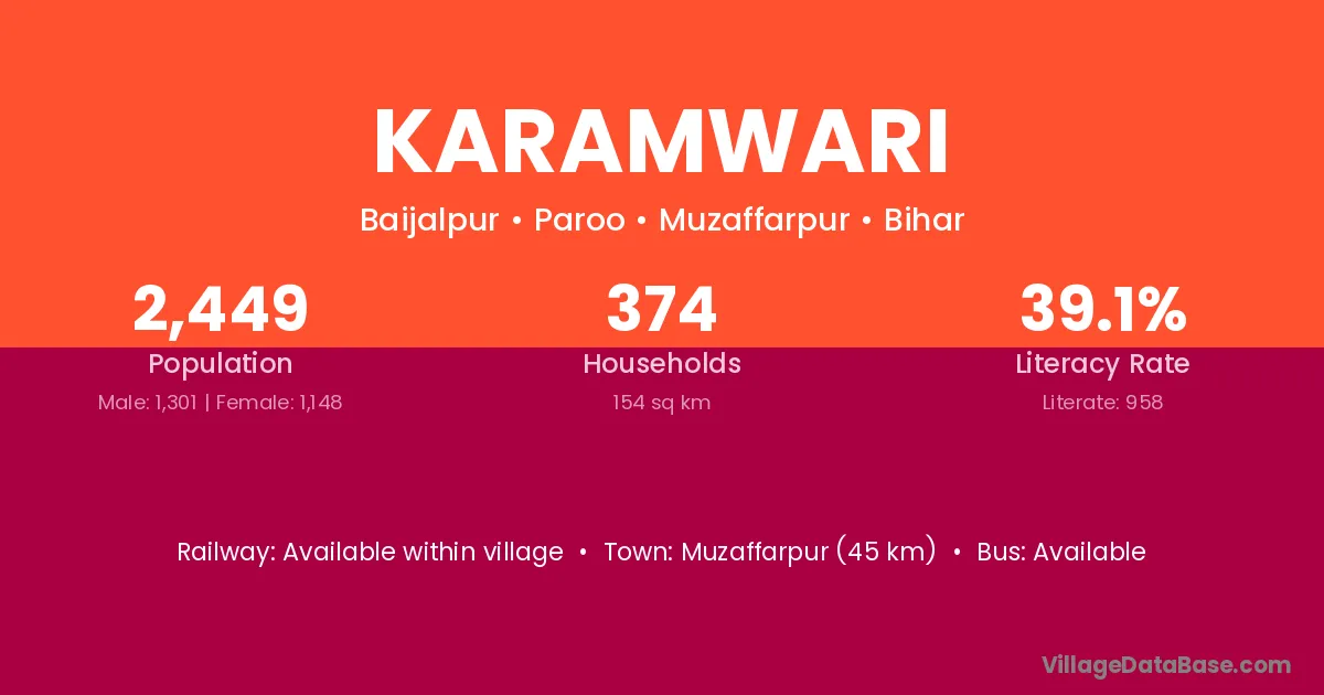 Muzaffarpur (45 km) is the nearest town to Karamwari village for major economic activities and is located approximately 45 km away.