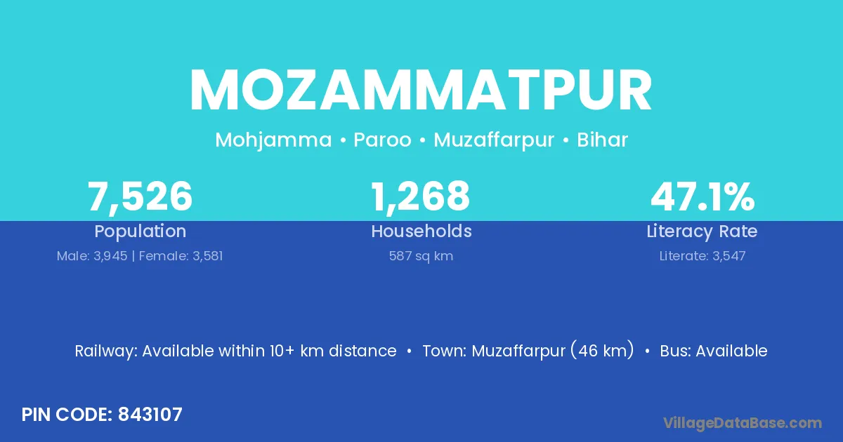 Muzaffarpur (46 km) is the nearest town to Mozammatpur village for major economic activities and is located approximately 46 km away.