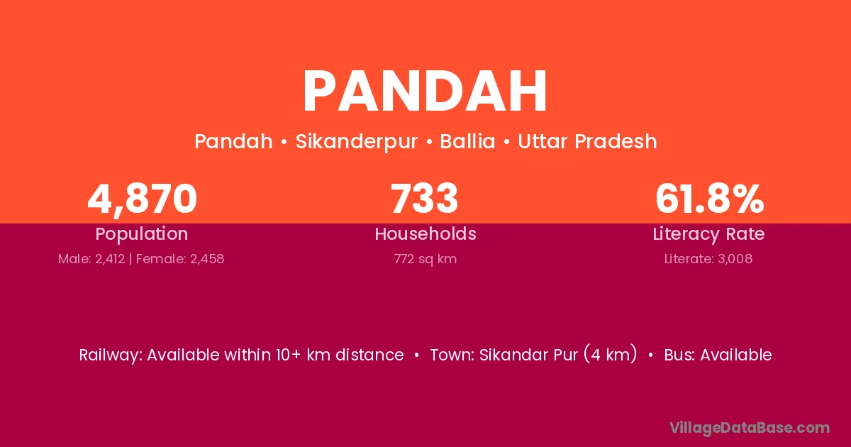 The literacy rate of Pandah village is 51.34%. Male literacy stands at 63.68% and female literacy at 37.77%.