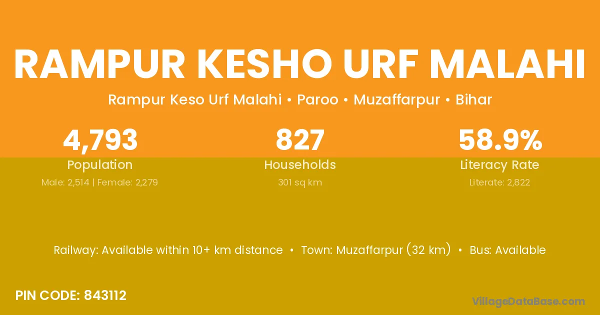 Muzaffarpur (32 km) is the nearest town to Rampur Kesho Urf Malahi village for major economic activities and is located approximately 32 km away.