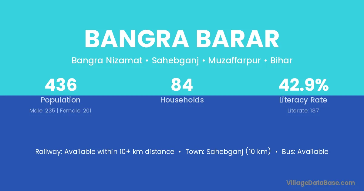 Sahebganj (10 km) is the nearest town to Bangra Barar village for major economic activities and is located approximately 10 km away.