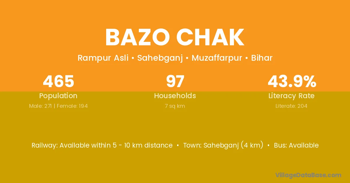 Sahebganj (4 km) is the nearest town to Bazo Chak village for major economic activities and is located approximately 4 km away.