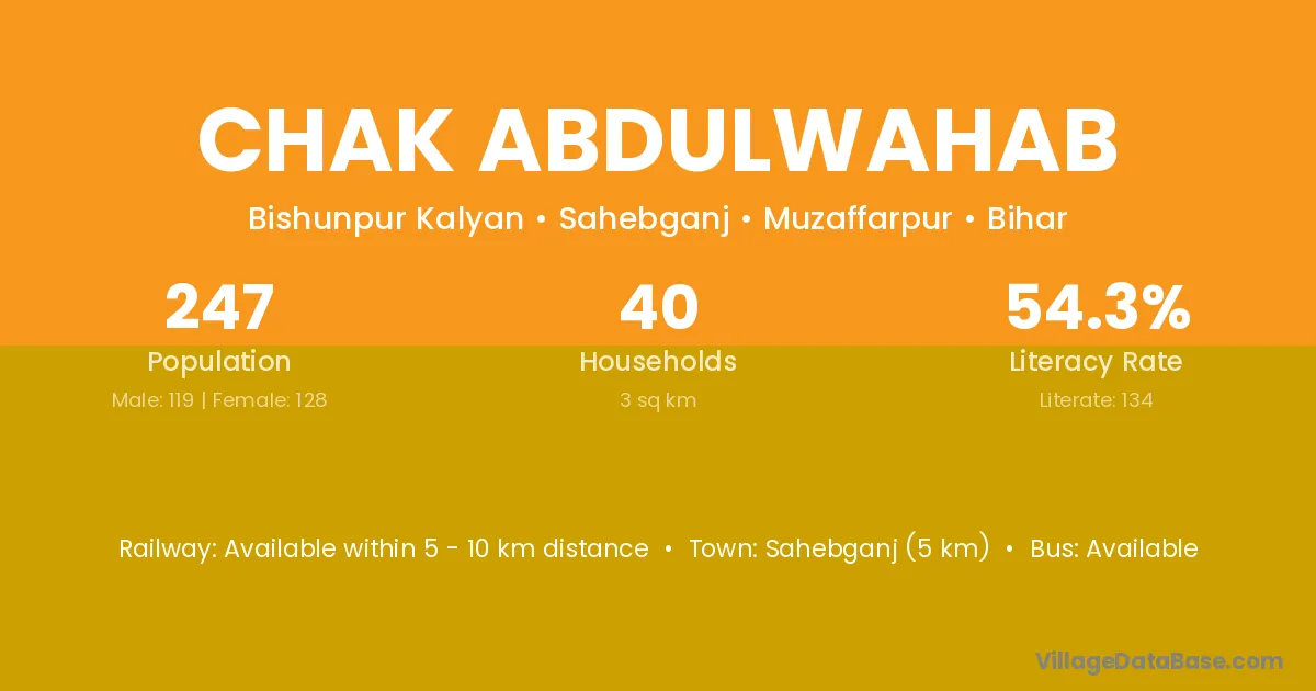 Sahebganj (5 km) is the nearest town to Chak Abdulwahab village for major economic activities and is located approximately 5 km away.