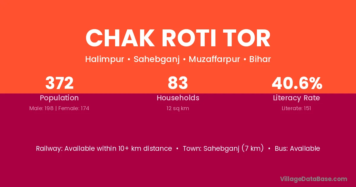 Sahebganj (7 km) is the nearest town to Chak Roti Tor village for major economic activities and is located approximately 7 km away.