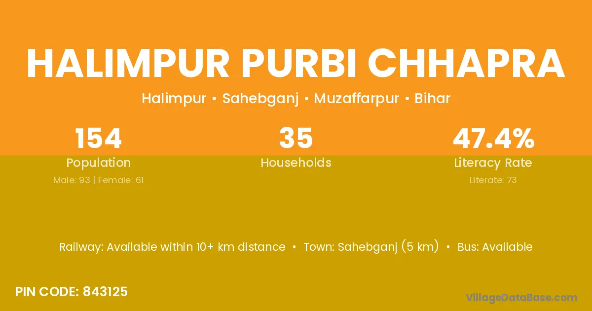 Sahebganj (5 km) is the nearest town to Halimpur Purbi Chhapra village for major economic activities and is located approximately 5 km away.