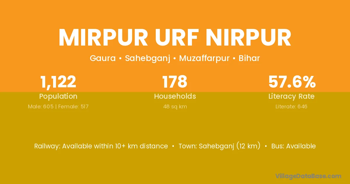 Sahebganj (12 km) is the nearest town to Mirpur Urf Nirpur village for major economic activities and is located approximately 12 km away.