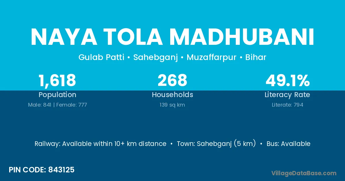 Naya Tola Madhubani village has a total population of 1,618 people, of which 841 are males and 777 are females.