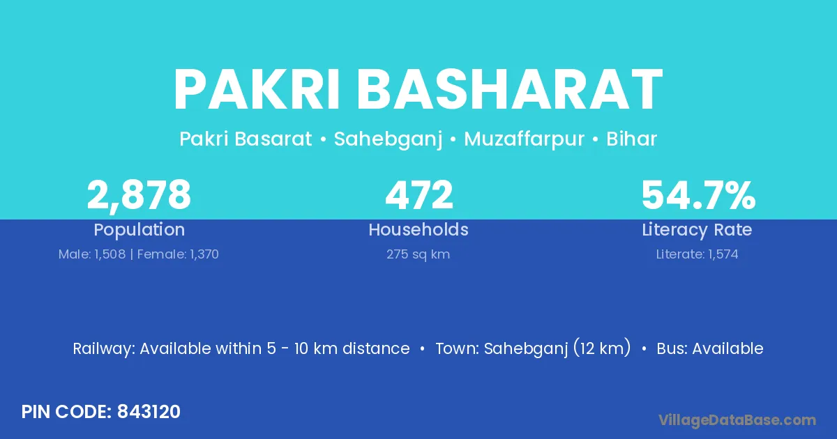 Sahebganj (12 km) is the nearest town to Pakri Basharat village for major economic activities and is located approximately 12 km away.