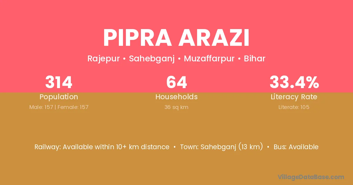 Sahebganj (13 km) is the nearest town to Pipra Arazi village for major economic activities and is located approximately 13 km away.