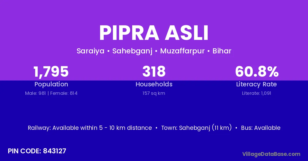 Sahebganj (11 km) is the nearest town to Pipra Asli village for major economic activities and is located approximately 11 km away.