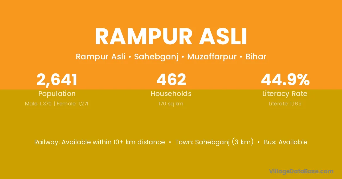 Sahebganj (3 km) is the nearest town to Rampur Asli village for major economic activities and is located approximately 3 km away.