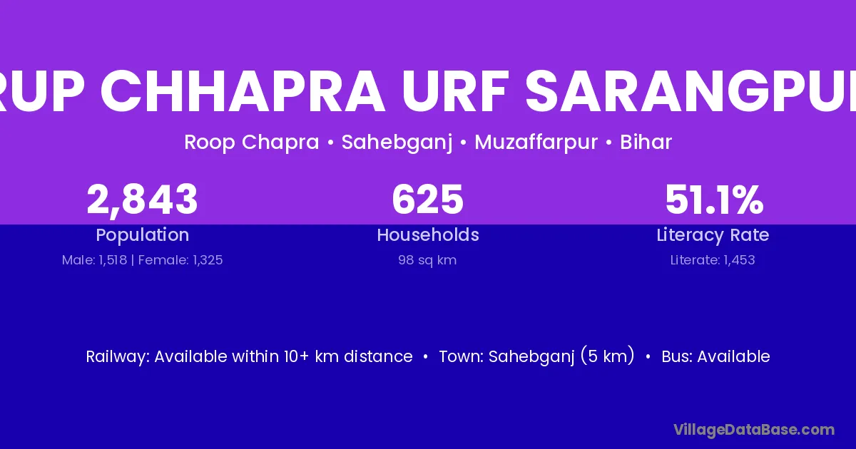 Rup Chhapra Urf Sarangpur village has a total population of 2,843 people, of which 1,518 are males and 1,325 are females.