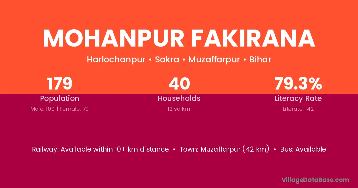 Mohanpur Fakirana village has a total population of 179 people, of which 100 are males and 79 are females.
