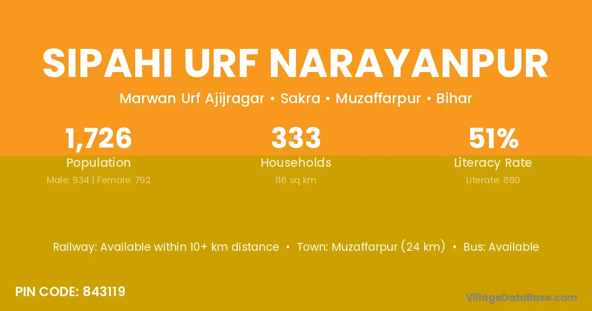 Muzaffarpur (24 km) is the nearest town to Sipahi Urf Narayanpur village for major economic activities and is located approximately 24 km away.