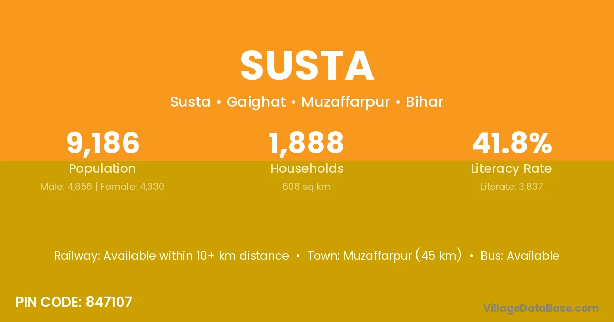 Muzaffarpur (21 km) is the nearest town to Susta village for major economic activities and is located approximately 21 km away.