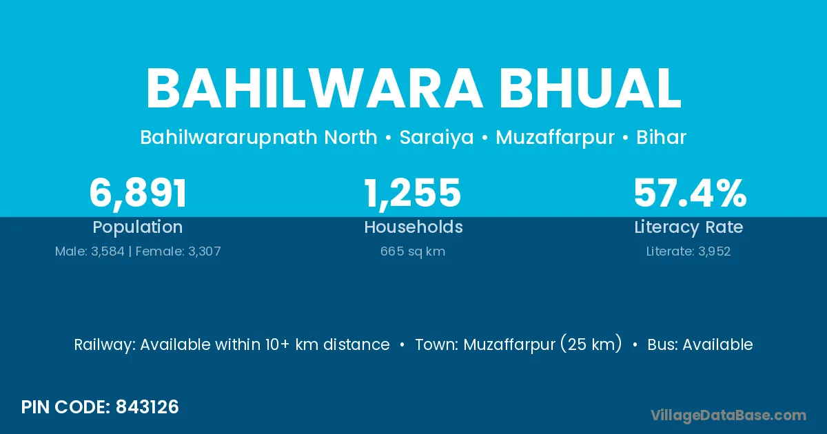 Muzaffarpur (25 km) is the nearest town to Bahilwara Bhual village for major economic activities and is located approximately 25 km away.