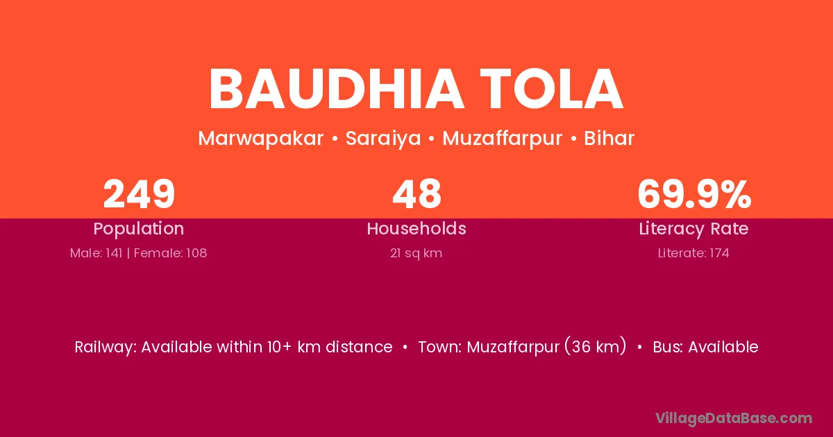 Muzaffarpur (36 km) is the nearest town to Baudhia Tola village for major economic activities and is located approximately 36 km away.