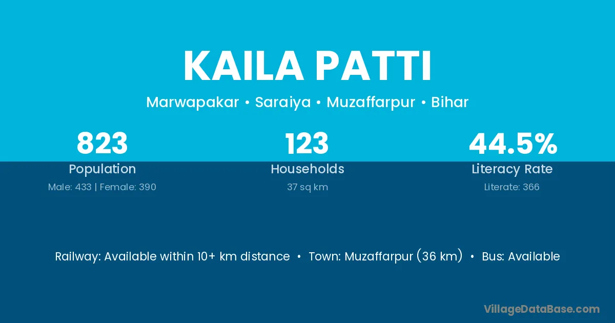 Muzaffarpur (36 km) is the nearest town to Kaila Patti village for major economic activities and is located approximately 36 km away.