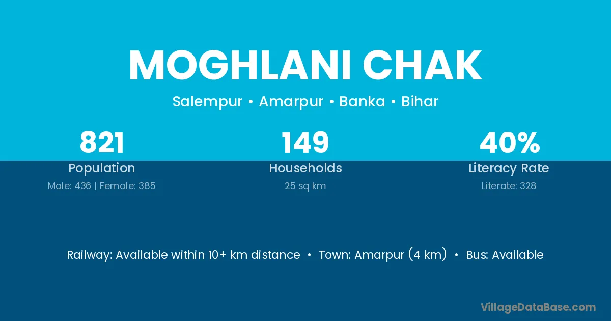 Moghlani Chak village has a total population of 489 people, of which 244 are males and 245 are females.