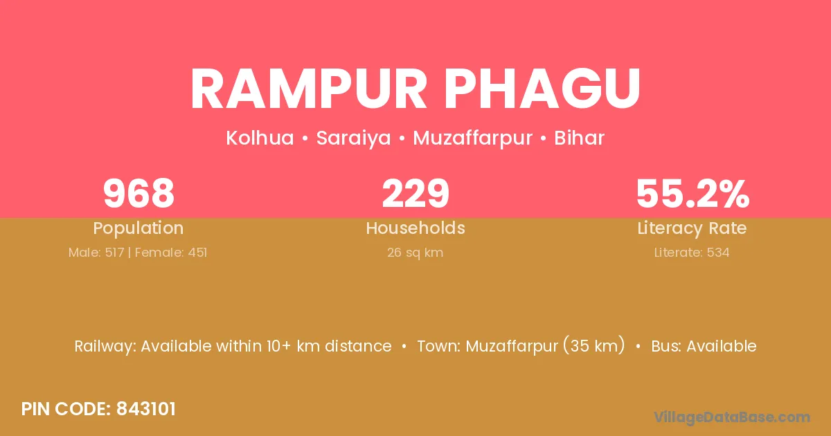 Muzaffarpur (35 km) is the nearest town to Rampur Phagu village for major economic activities and is located approximately 35 km away.