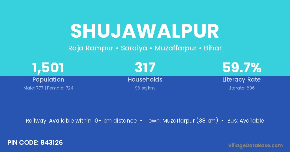 Muzaffarpur (38 km) is the nearest town to Shujawalpur village for major economic activities and is located approximately 38 km away.