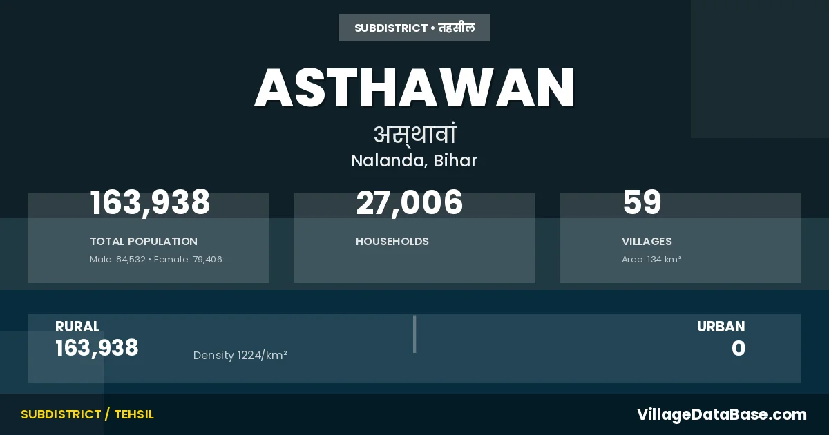 According to the 2011 census The total area of Asthawan Subdivision is 134 km², with a population of 163938 people. The population density is 1,224 inhabitants per square kilometre, and there are approximately 27006 houses in the sub district.