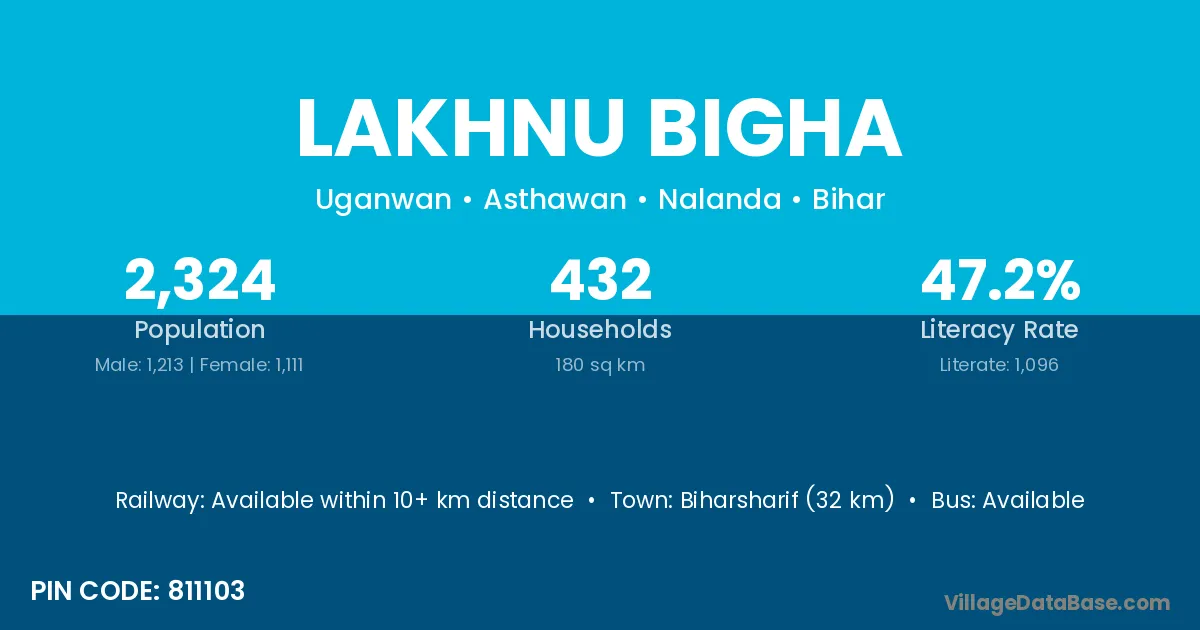 Biharsharif (32 km) is the nearest town to Lakhnu Bigha village for major economic activities and is located approximately 32 km away.