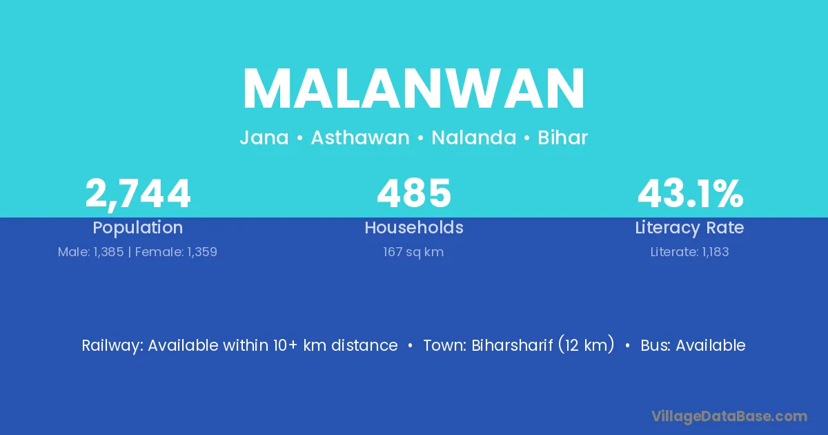 Biharsharif (12 km) is the nearest town to Malanwan village for major economic activities and is located approximately 12 km away.