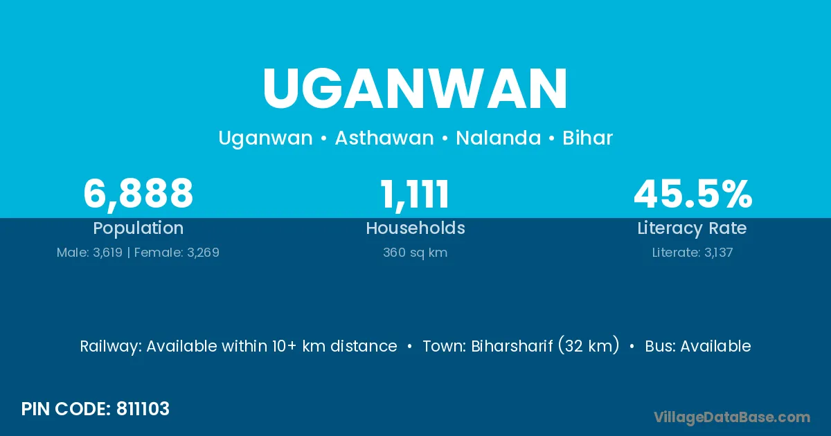 Biharsharif (32 km) is the nearest town to Uganwan village for major economic activities and is located approximately 32 km away.