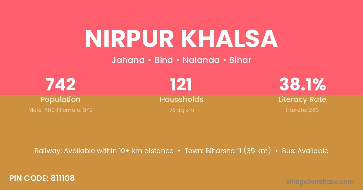 Biharsharif (35 km) is the nearest town to Nirpur Khalsa village for major economic activities and is located approximately 35 km away.