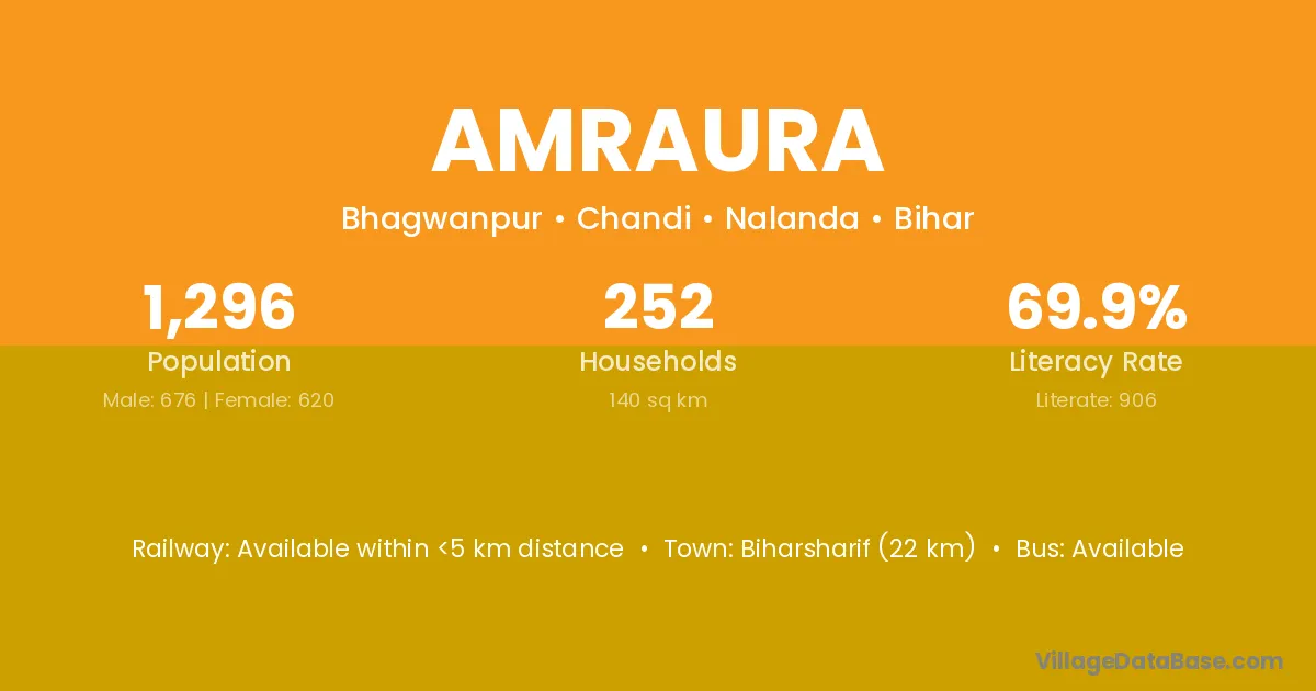 Biharsharif (22 km) is the nearest town to Amraura village for major economic activities and is located approximately 22 km away.