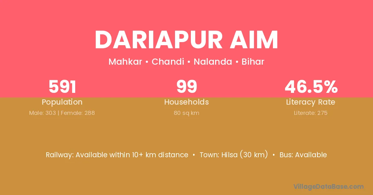 Dariapur Aim village has a total population of 591 people, of which 303 are males and 288 are females.