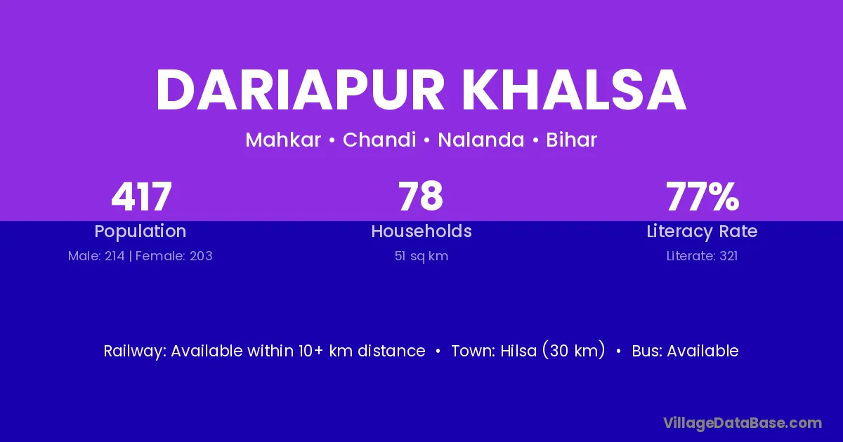 Hilsa (30 km) is the nearest town to Dariapur Khalsa village for major economic activities and is located approximately 30 km away.
