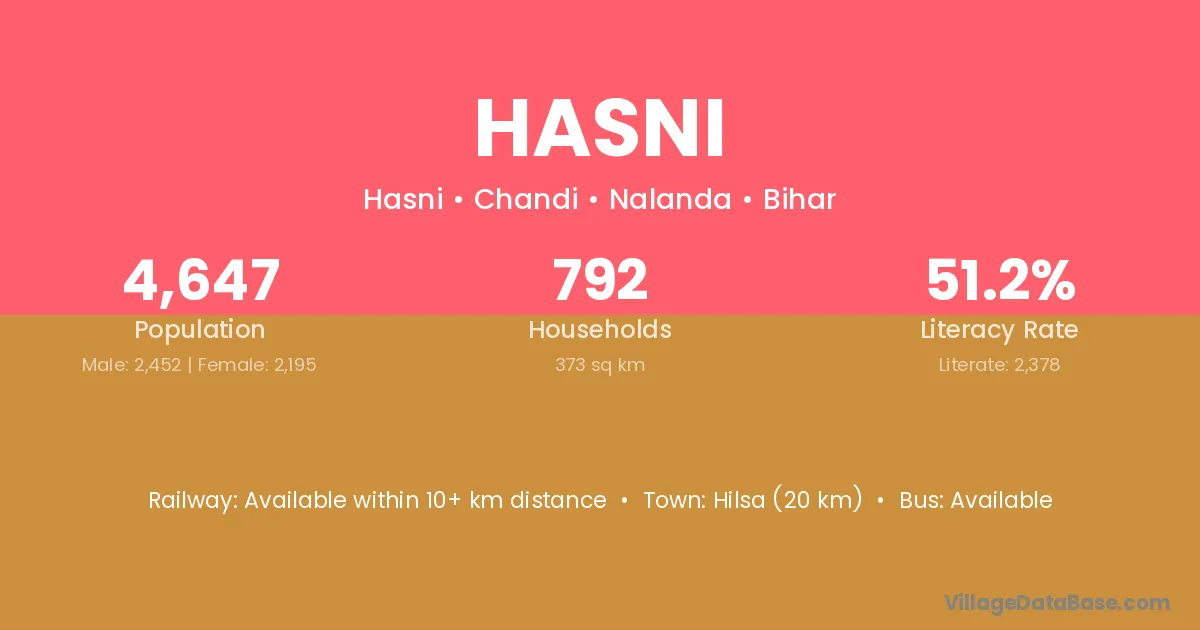 Hilsa (20 km) is the nearest town to Hasni village for major economic activities and is located approximately 20 km away.