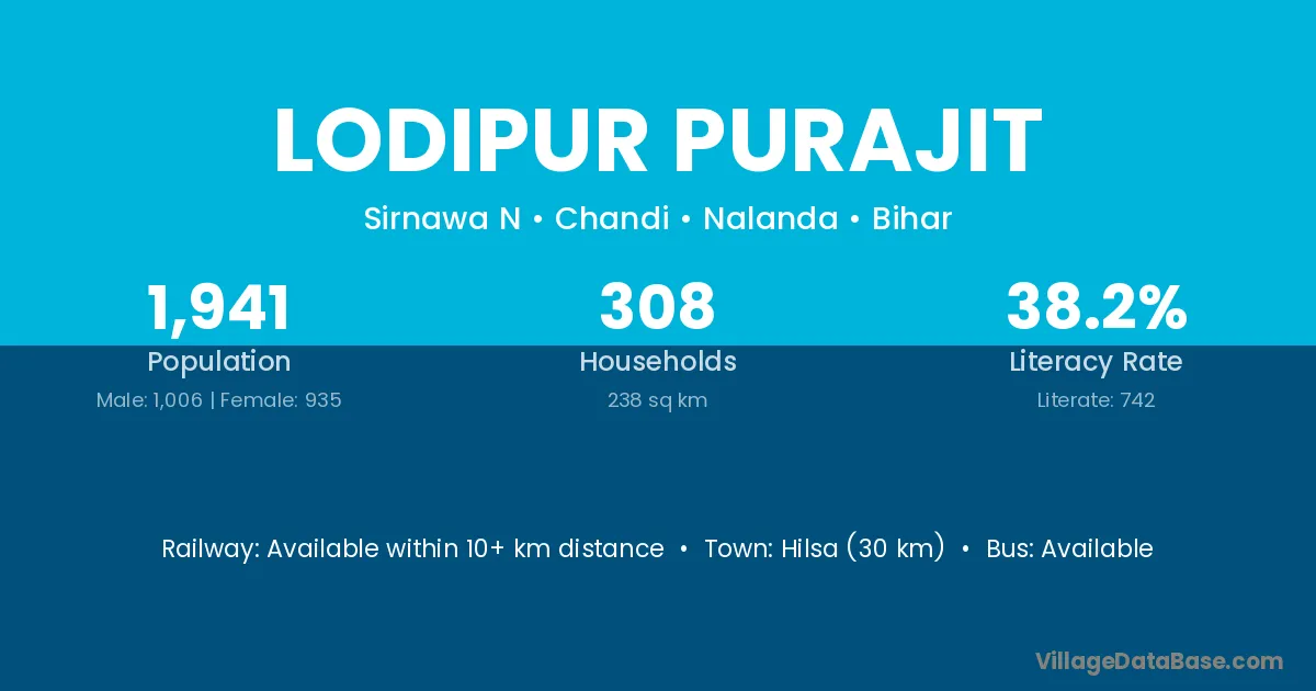 Hilsa (30 km) is the nearest town to Lodipur Purajit village for major economic activities and is located approximately 30 km away.