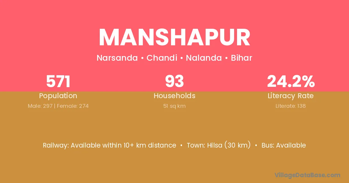 Hilsa (30 km) is the nearest town to Manshapur village for major economic activities and is located approximately 30 km away.