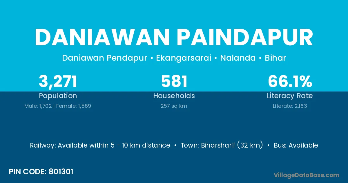 Biharsharif (32 km) is the nearest town to Daniawan Paindapur village for major economic activities and is located approximately 32 km away.