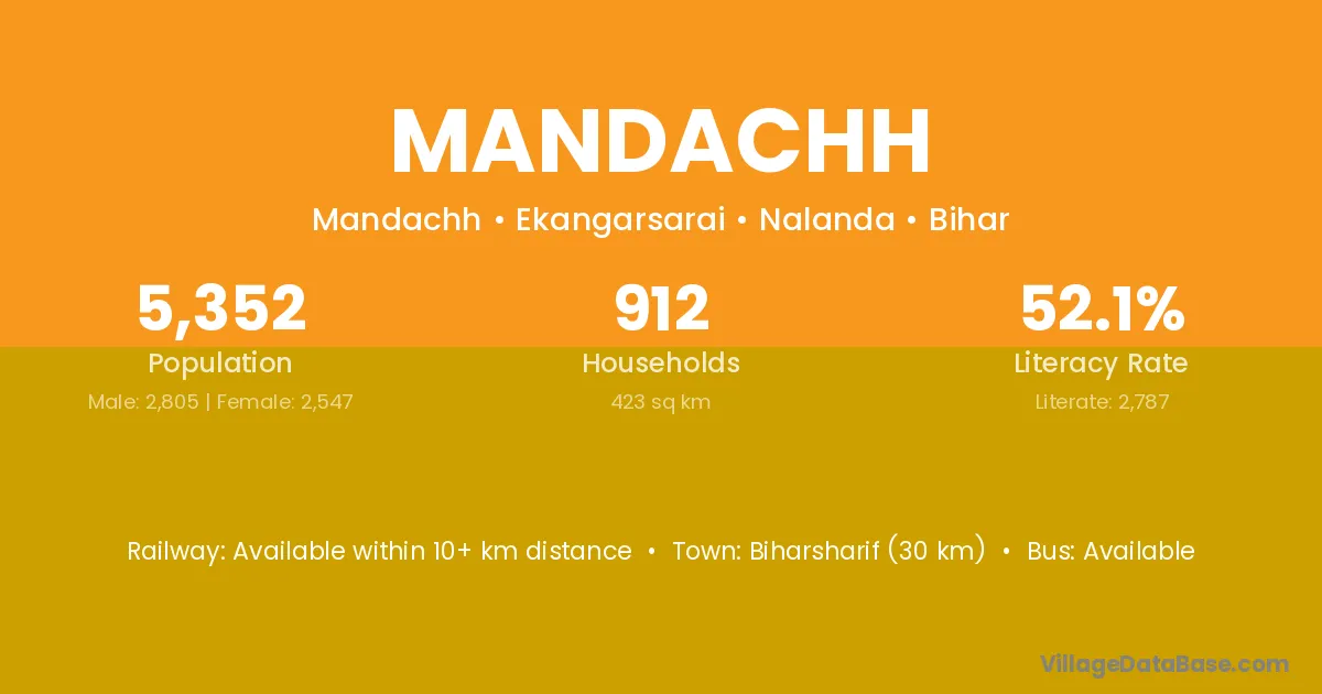 Biharsharif (30 km) is the nearest town to Mandachh village for major economic activities and is located approximately 30 km away.