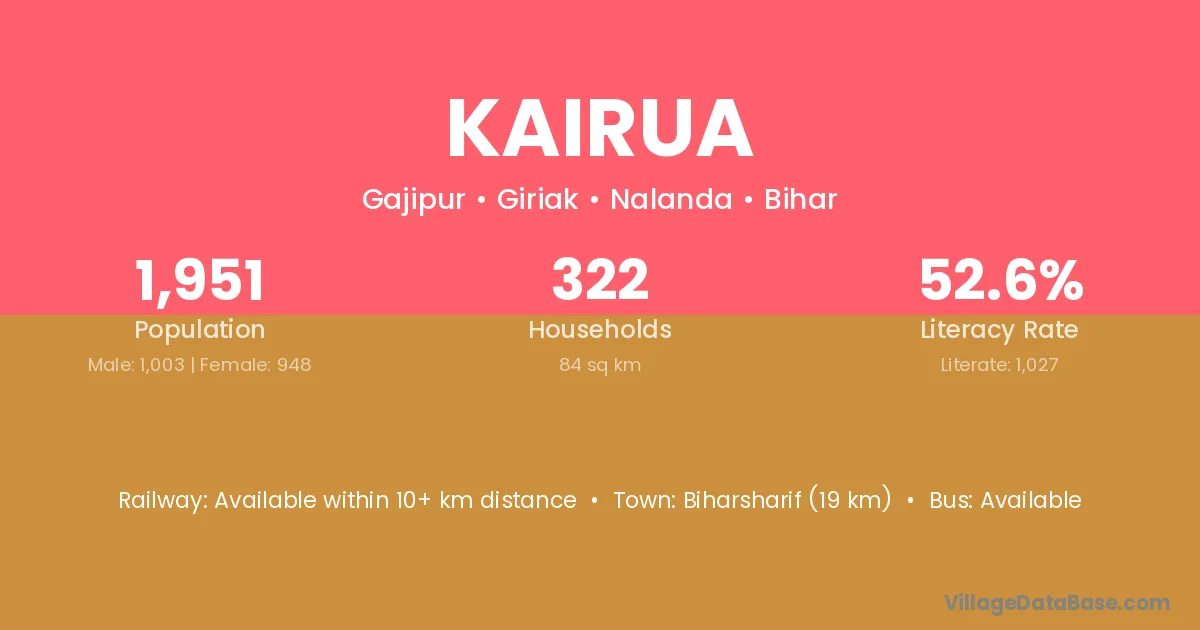 Biharsharif (19 km) is the nearest town to Kairua village for major economic activities and is located approximately 19 km away.