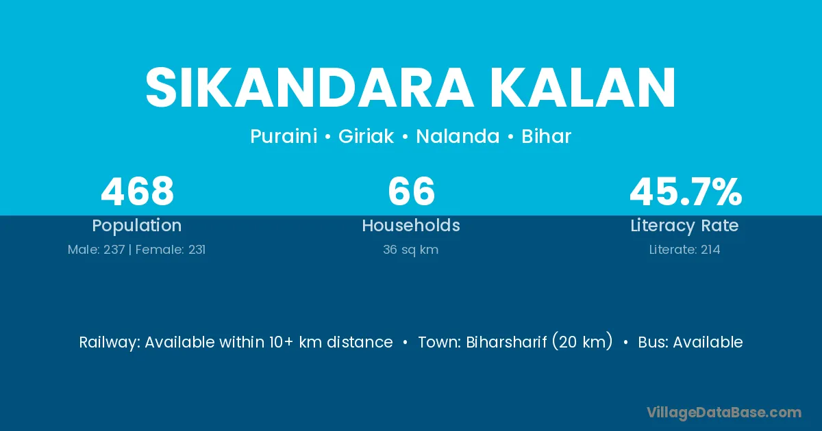 Biharsharif (20 km) is the nearest town to Sikandara Kalan village for major economic activities and is located approximately 20 km away.