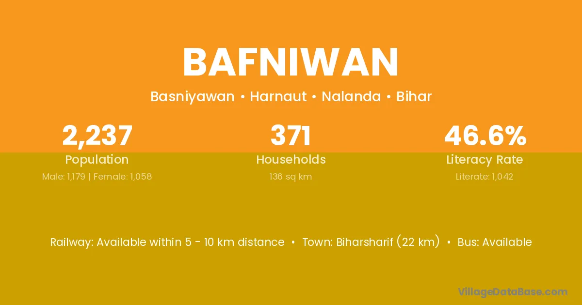 Biharsharif (22 km) is the nearest town to Bafniwan village for major economic activities and is located approximately 22 km away.