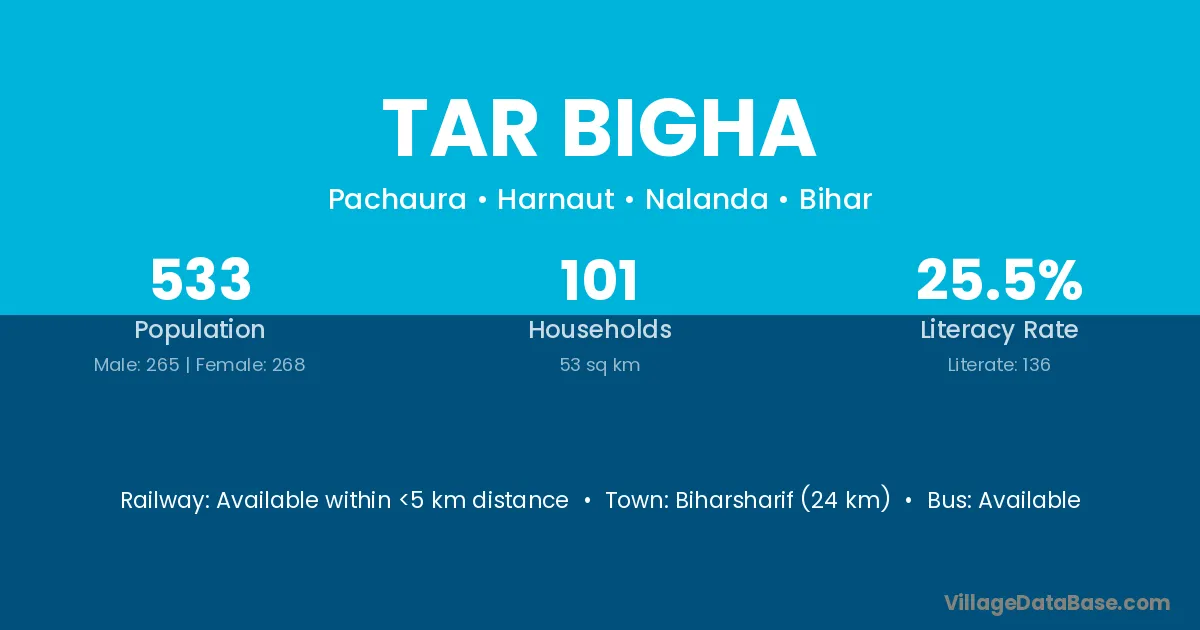 Biharsharif (24 km) is the nearest town to Tar Bigha village for major economic activities and is located approximately 24 km away.
