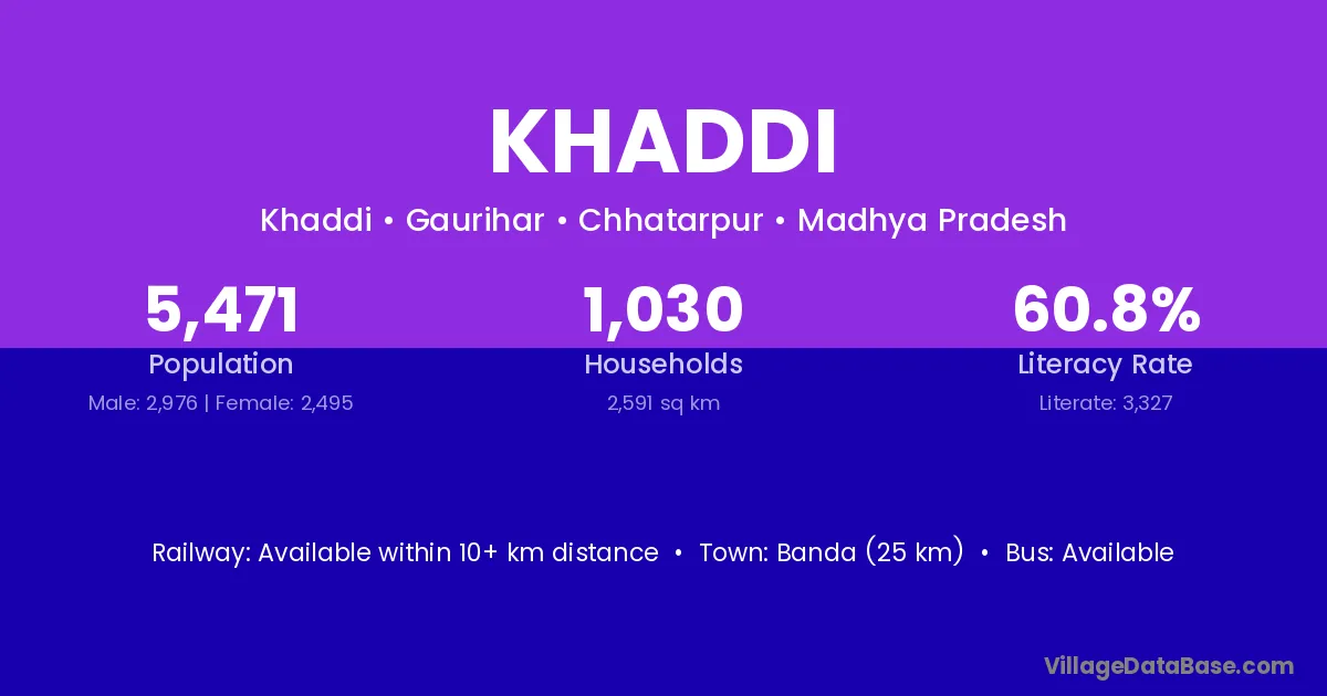The literacy rate of Khaddi village is 36.76%. Male literacy stands at 46.64% and female literacy at 25.84%.