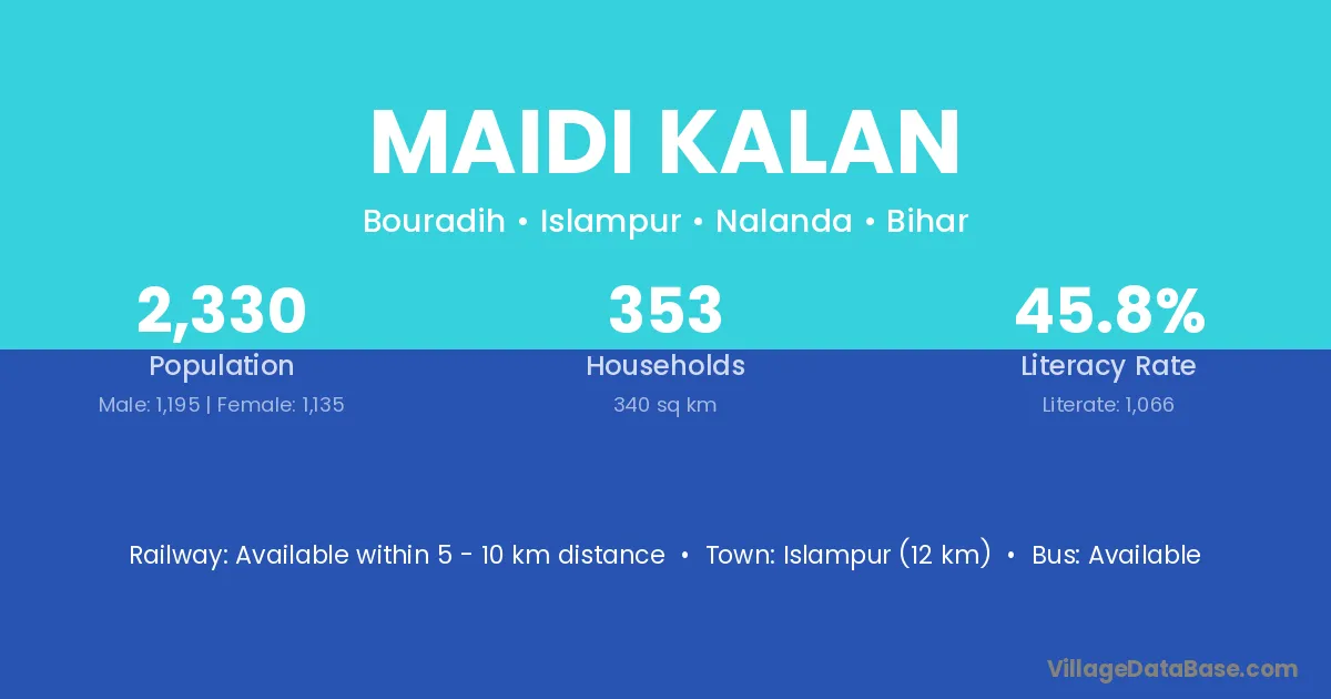 Islampur (12 km) is the nearest town to Maidi Kalan village for major economic activities and is located approximately 12 km away.