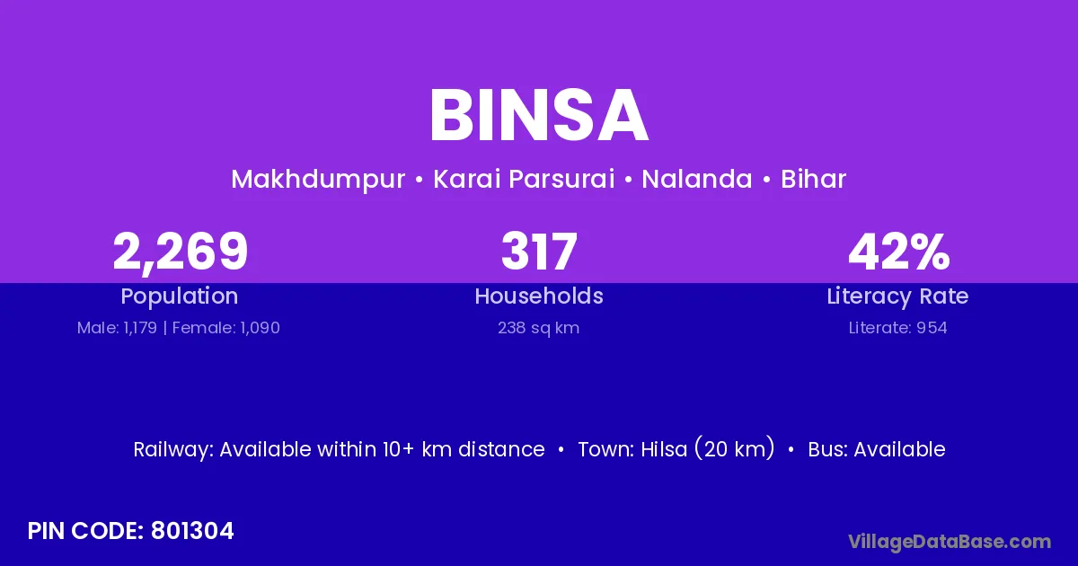 Hilsa (20 km) is the nearest town to Binsa village for major economic activities and is located approximately 20 km away.