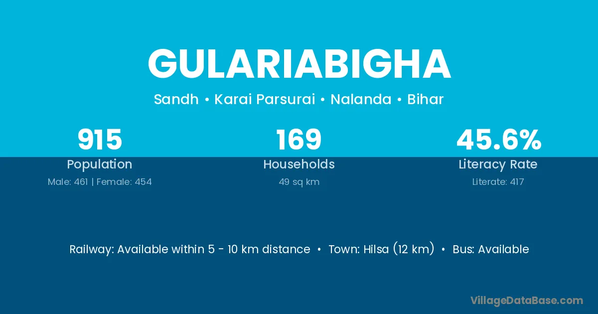 Gulariabigha village has a total population of 915 people, of which 461 are males and 454 are females.