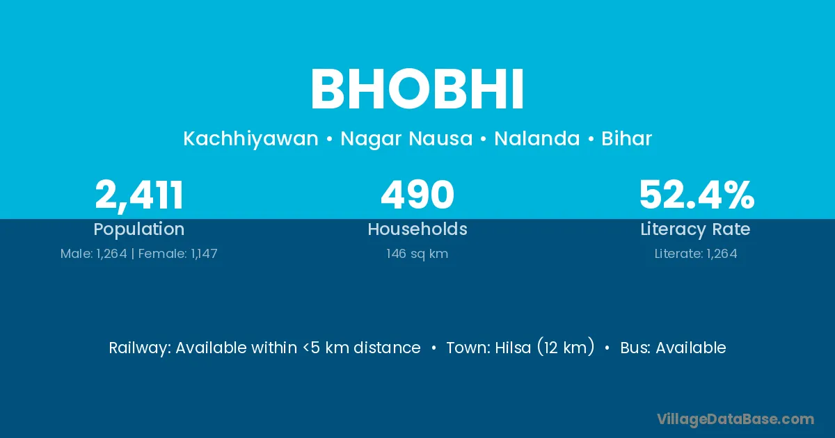 Hilsa (12 km) is the nearest town to Bhobhi village for major economic activities and is located approximately 12 km away.