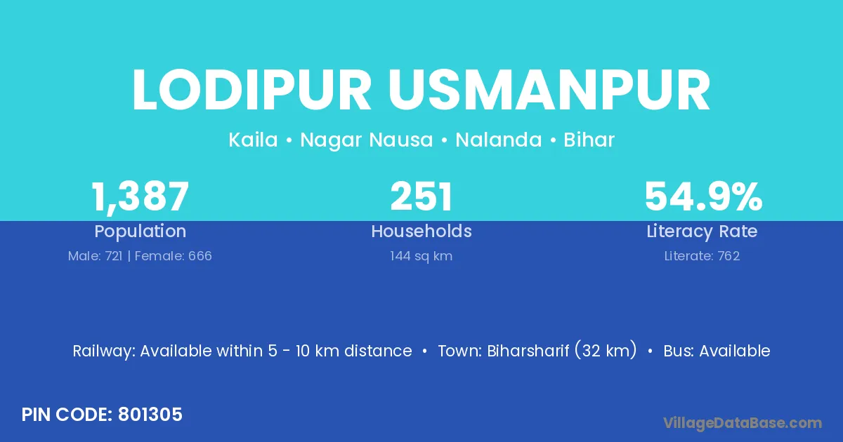 Biharsharif (32 km) is the nearest town to Lodipur Usmanpur village for major economic activities and is located approximately 32 km away.