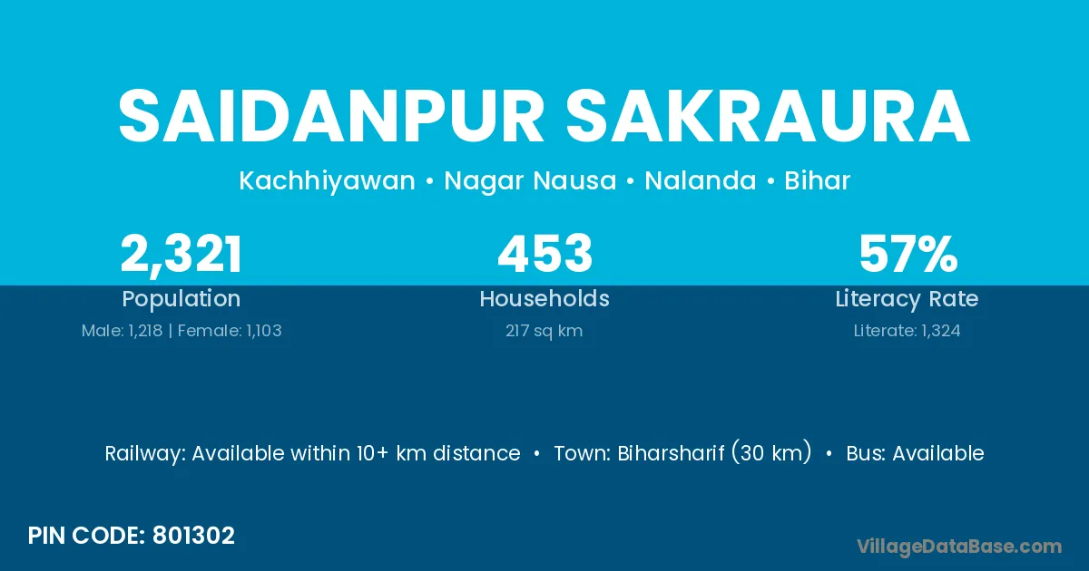 Biharsharif (30 km) is the nearest town to Saidanpur Sakraura village for major economic activities and is located approximately 30 km away.